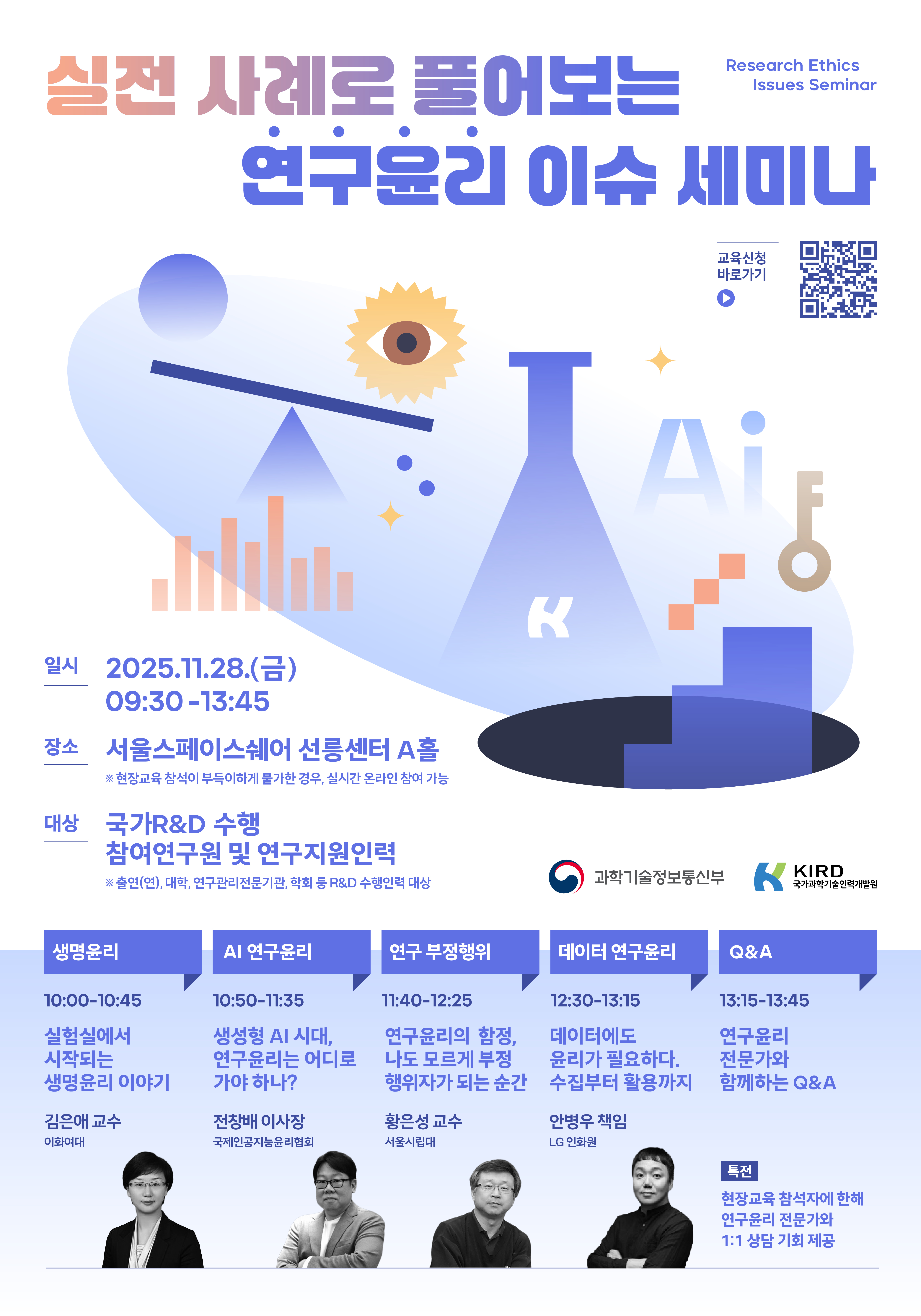 과학기술정보통신부와 국가과학기술인력개발원에서는 최신 연구윤리 이슈 공유 및 실무사례 기반 역량 강화를 위해 '연구윤리 이슈 세미나' 교육을 실시할 예정입니다.